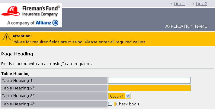 The error section is displayed whenever an error condition is encountered on an application page. The error section is wrapped in a containing div that is initially hidden, but displayed when one or more error conditions are triggered. If the error relates to any missing values for required fields within a page form, any required fields with missing values are highlited with an orange background to draw the user's attention to areas on the page that need to be completed.